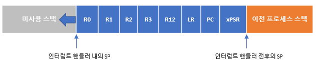 스택에 있는 레지스터의 복사본을 스택 프레임이라고하며 그림과 같이 레지스터 R0~R3, R12, LR, PC, xPSR입니다.
