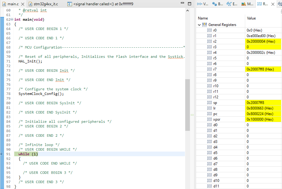 아래 예시는 while 구문 Context 에서의 Core registers입니다. 현재 Stack pointer는 0x20007ff8 입니다.