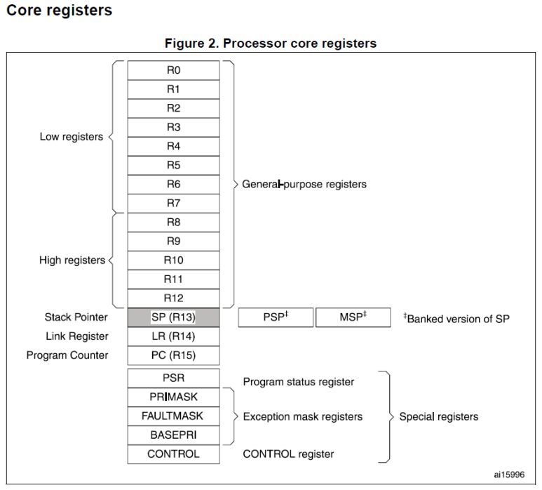 아래 그림은 Core registers 인데 우리는 이 레지스터를 통해 CPU의 현재 상태를 알 수 있습니다.