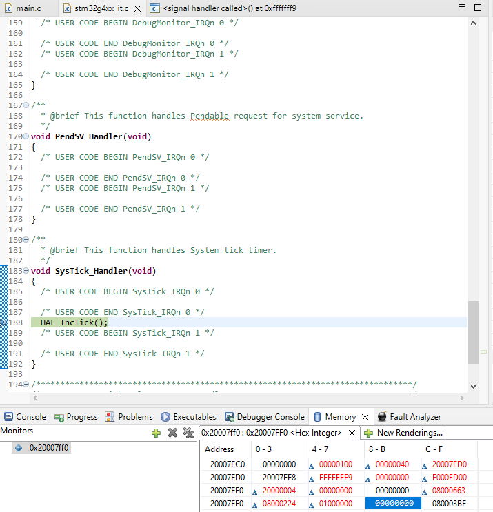 인터럽트가 걸리면 현재의 Core register를 Stacking하게 되며 따라서 Stack pointer 값이 0x20007ff8 + (8 * 4bytes) = 0x20007fd8 로 변경될것입니다. 이제 interrupt에서 0x20007ff4 번지의 Stack 에 backup 되어 있는 내용을 확인 하도록 하겠습니다.