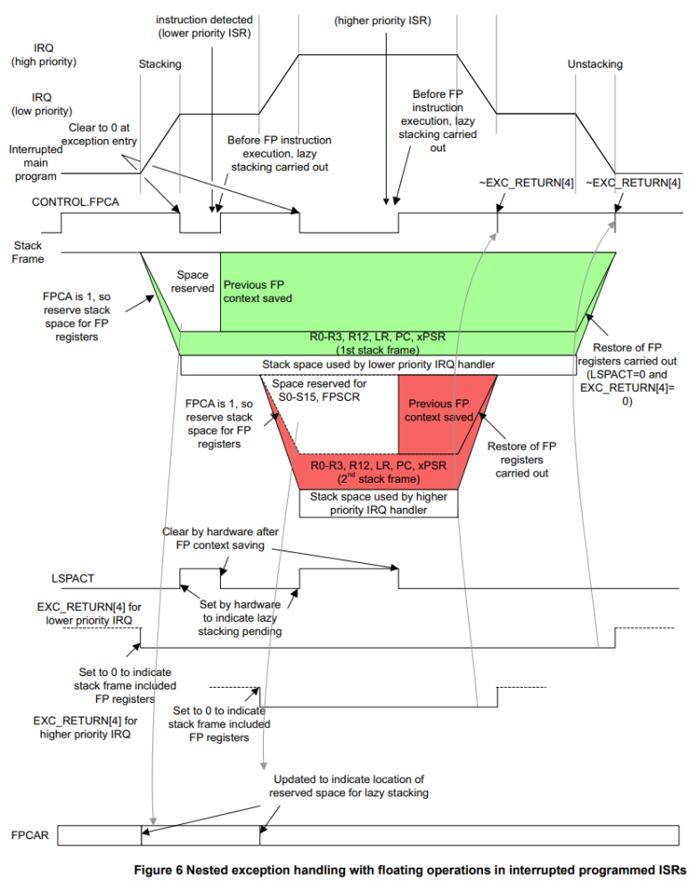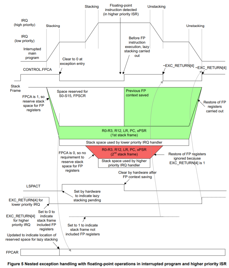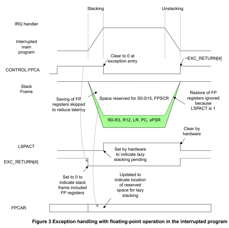 애플리케이션이 이전에 CONTROL 레지스터의 비트[2]로 표시된 FPU를 사용한 경우 FPCA는 자동으로 1로 설정됩니다. 인터럽트가 발생하고 lazy stacking 기능이 켜져 있으면 프로세서는 S0-S15 레지스터 및 FPSCR용 프레임을 위해 스택에 추가 공간을 예약합니다. 그러나 이러한 레지스터의 실제 stacking은 일어나지 않으며 이를 나타내기 위해 FPCCR, LSPACT(Lazy State Preservation Active)의 비트[0]이 1로 설정됩니다. 예외 항목에서 생성된 EXC_RETURN 값의 비트[4]는 0으로 설정되어 실제 레지스터 내용은 없지만 예외 스택 프레임에 부동 소수점 레지스터에 대한 스택 공간이 있음을 나타냅니다.