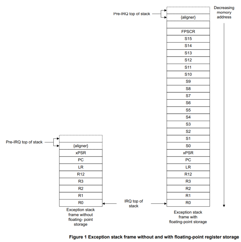 사용 중인 스택 프레임 유형은 CONTROL 특수 레지스터의 FPCA 비트에 표시된 대로 FPCCR의 설정과 FPU가 현재 컨텍스트에서 이미 사용되었는지 여부에 따라 하드웨어에 의해 자동으로 결정됩니다. FPCA가 설정되고 자동 상태 저장 기능이 활성화된 경우 부동 소수점 저장소가 있는 예외 스택 프레임이 사용됩니다. 인터럽트 처리가 완료된 후 나중에 현재 컨텍스트에서 FPU의 레지스터 값이 필요할 수 있기 때문입니다.