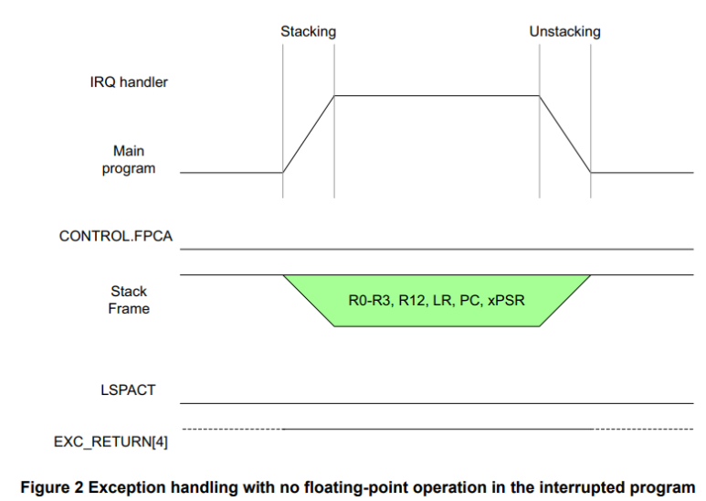 - 인터럽트 핸들러가 FPU를 사용하지 않으면 LSPACT는 인터럽트가 끝날 때까지 HIGH로 유지됩니다. 인터럽트에서 복귀할 때 프로세서 하드웨어는 EXC_RETURN의 비트[4]가 0이고 LSPACT가 1임을 감지하여 스택 프레임에 부동 소수점 레지스터를 위한 공간이 포함되어 있지만 스택에 푸시되지 않았음을 나타냅니다. 부동 소수점 레지스터는 무시됩니다.