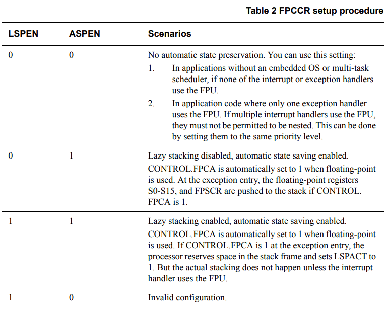 lazy stacking을 활성화하려면 always save enable를 나타내는 ASPEN이라는 FPCCR의 비트[31]과 lazy save enable를 나타내는 LSPEN이라는 비트[30]이 둘 다 1로 설정되어야 합니다. 이것이 기본값입니다. LSPEN을 0으로 설정하여 lazy stacking을 비활성화할 수 있습니다.