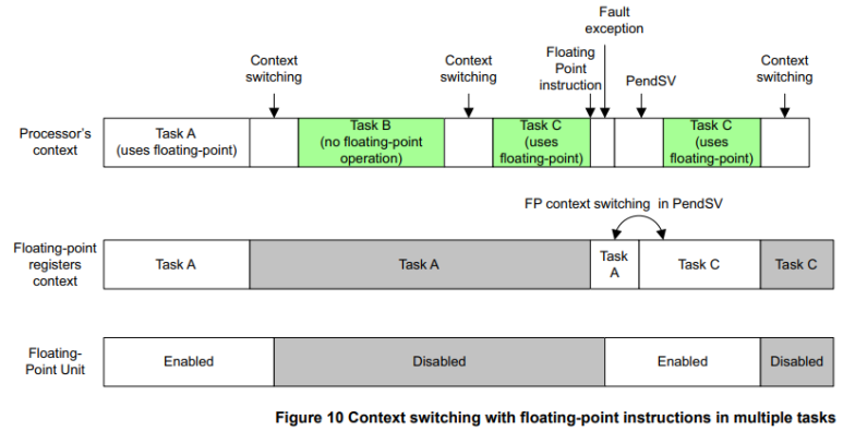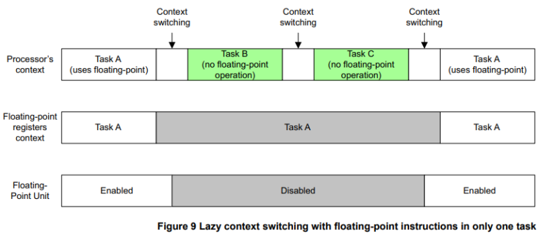 컨텍스트 스위칭 중에 다른 애플리케이션 작업으로 전환하면 FPU가 비활성화됩니다. OS가 컨텍스트를 FPU를 사용한 마지막 프로세스로 다시 전환하면 컨텍스트 스위칭 코드에 의해 장치가 다시 활성화됩니다. FPU가 비활성화되더라도 내부 컨텍스트 정보는 유지됩니다. FPU의 비활성화 또는 활성화는 주소 0xE000ED88에서 CPACR(Co-Processor Access Control Register)을 사용하여 처리할 수 있습니다.