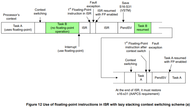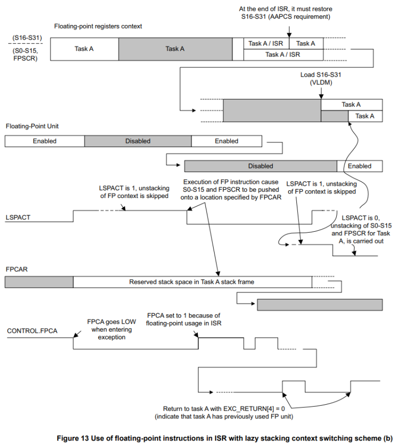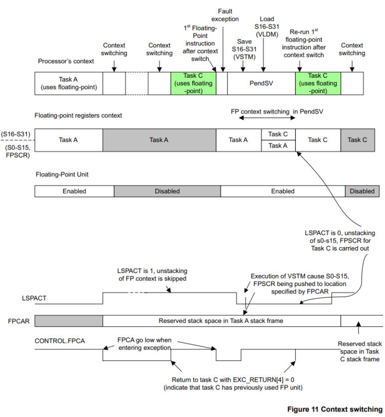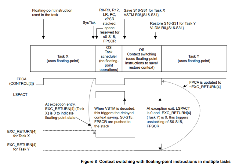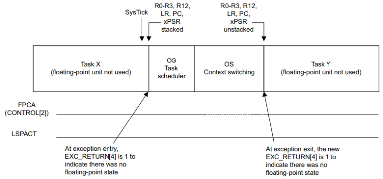 이 일련의 처리들에서 FPU가 필요한 작업에 대한 각 컨텍스트 스위치는 부동 소수점 레지스터의 저장 및 복원을 처리하기 위해 레지스터 S0-S31 및 FPSCR을 사용하는 최소 2 x 34 = 68 사이클과 컨텍스트 스위칭 소프트웨어의 추가 사이클을 필요로 합니다. EXC_RETURN에서 비트[4]의 상태를 확인하십시오. EXC_RETURN[4] 비트의 검사는 컨텍스트 스위칭 소프트웨어 내에서 수행되어야 합니다.