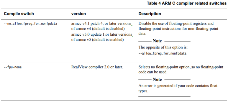 Keil MDK-ARM 4.21(armcc v4.1.0.713) 또는 armcc 버전 4.1을 기반으로 하는 이후 버전에서 --no_allow_fpreg_for_nonfpdata 옵션을 C/C++ 옵션의 Misc Controls 필드에 추가하여 비부동 소수점 코드에서 부동 소수점 명령어 사용을 비활성화해야 합니다.