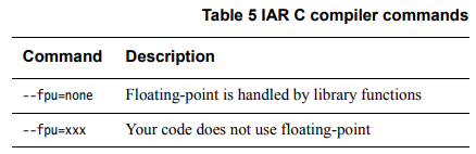 표 5는 IAR C 컴파일러가 다음 두 가지 경우에 부동 소수점 레지스터를 사용하지 않음을 보여줍니다.