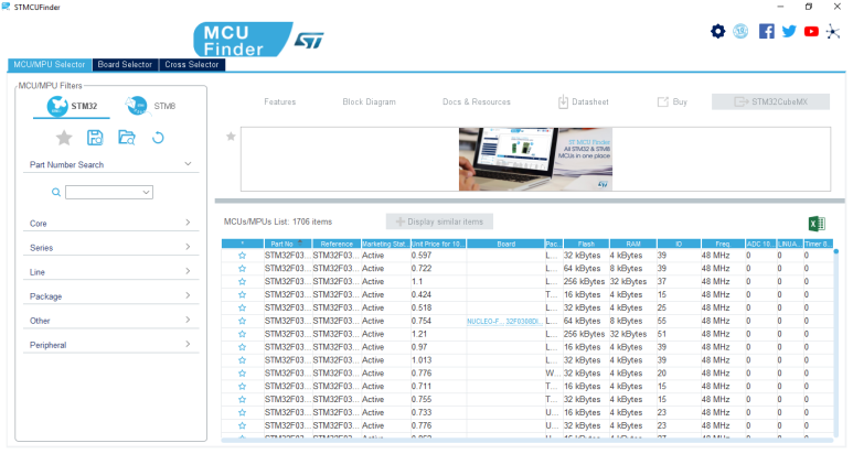 MCU Finder의 실행화면은 다음과 같은습니다. 좌측에 Core/Series/Line/Package/Other/Peripheral 당의 필터를 이용하여 MCU를 찾을 수 있습니다. 그리고 MCU의 Datasheet 등의 자료도 링크로 제공되고 있으니 원하는 MCU를 보다 쉽게 찾아 볼 수 있습니다.