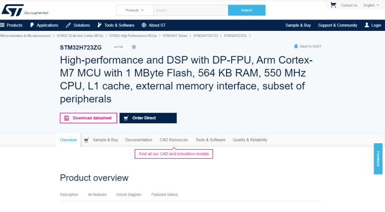 첫 줄에 stm32h723zg의 소개 페이지로 연결되어 있습니다. 해당 페이지로 이동해 볼까요?