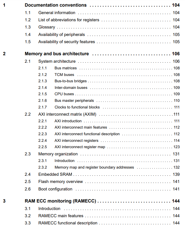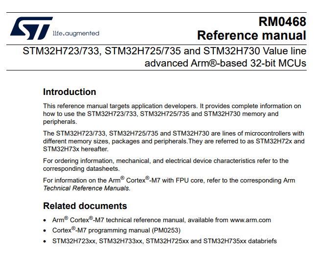 Datasheet는 MCU의 정보, 전기적 특성, 패키지 정보 등에 대한 내용을 담고 있다면 Reference Manual은 실제 애플리케이션 개발자를 대상으로 하며 MCU 메모리 및 주변 장치(Peripheral) 사용 방법에 대한 가능한 완전한(?) 정보를 제공하는 것에 목적을 두고 있습니다. 따라서 실제 어플리케이션 개발시 계속해서 열람하여 보게되는 사전과 같은 문서입니다.