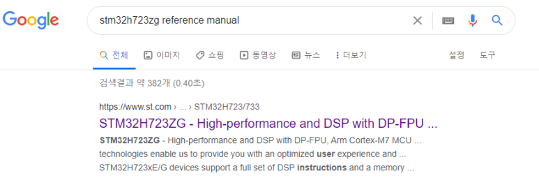 Reference Manual을 찾는 방법중 google.com에서 "MCU 명 reference manual" 로 찾는 방법을 소개하도록 하겠습니다. 먼저 google.com에서 "stm32h723zg reference manual"로 검색하도록 하겠습니다.