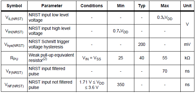 외부에는 노이즈 제거목적의 MCU에 가깝게 배치되는 캐패시터와 리셋을 발생시킬 오픈드레인의 스위치 정도면 됩니다. 그렇다면 리셋을 걸리게할 수 있는 Low Level의 특성은 어떻게 될까요? 데이터 시트에 아래와 같이 나와있습니다.