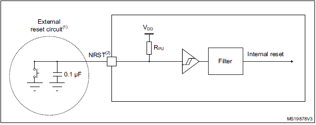 기본적으로 STM32에 RESET을 걸어주기 위해서 외부의 특별한 회로가 필요하지 않습니다. 아래 블럭도 처럼 내부에 Pull-up (Rpu) 이 존재하기 때문입니다.