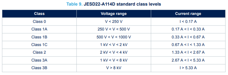 HBM은 구성 요소 장치의 USB 핀이 최대 2kV Discharge을 견딜 수 있어야 하며, 이는 STM32 MCU의 경우입니다. JESD22-A114D 표준 테스트 파형 및 클래스 레벨은 아래 그림과 표를 참조하십시오.