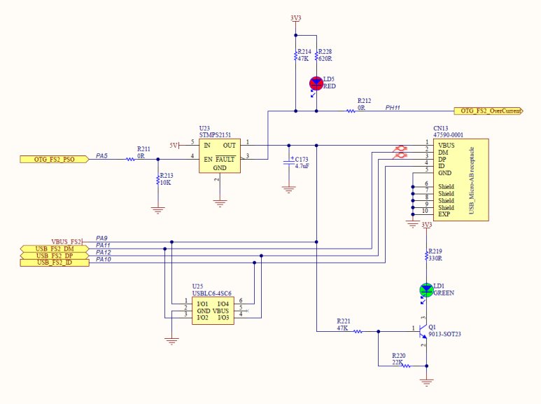 일례로 아래는 STM32H745 Nucleo 보드의 USB OTG 회로도 입니다. 이와같이 여러분들이 만들고자 하는 회로도와 최대한 비슷한 레퍼런스 보드를 참조하시어 회로에 활용하시면 됩니다.