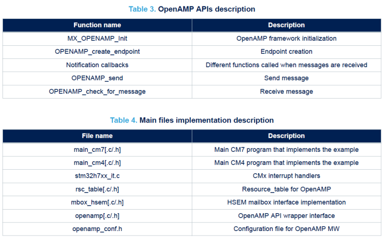 STM32CubeH7 패키지에는 OpenAMP 및 FreeRTOS™ 메시지 버퍼를 사용한 프로세서 간 통신을 포함하여 듀얼 코어 애플리케이션을 위한 몇 가지 예가 포함되어 있습니다. 다음 섹션에서는 OpenAMP 및 FreeRTOS™를 사용하는 몇 가지 예와 하드웨어 세마포어를 사용하는 기타 예를 설명합니다.