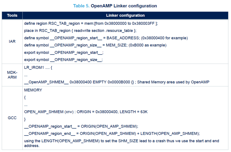 OpenAMP의 경우 공유 리소스 테이블과 공유 버퍼에 일부 메모리를 할당해야 합니다. 이는 아래 표에 제시된 구문을 사용하여 두 CPU의 링커 파일에서 수행할 수 있습니다.