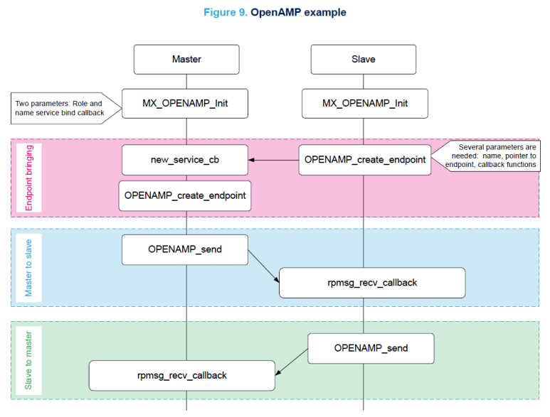 다음 그림은 CPU1을 마스터로, CPU2를 슬레이브로 정의한 예를 보여줍니다. 시스템 초기화 후 두 CPU 모두 OpenAMP 프레임워크 초기화를 담당하는 MX_OPENAMP_Init() 함수를 실행합니다. CPU2(슬레이브)는 엔드포인트 생성을 담당하며 이는 OPENAMP_create_endpoint() API를 사용하여 수행됩니다.