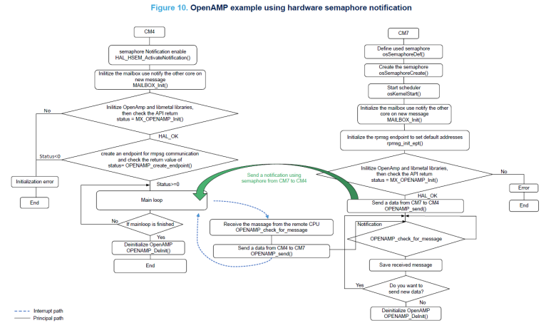 이 그림은 하드웨어 세마포어 알림을 사용하는 OpenAMP용 스니펫 코드가 있는 순서도를 보여줍니다.
