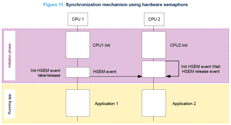 다음 그림은 하드웨어 세마포어를 사용한 동기화 메커니즘을 보여줍니다. 두 코어가 병렬로 부팅되도록 프로그래밍되면 CPU1이 측면에서 시스템 초기화를 완료했음을 CPU2가 알 수 있도록 템플릿 코드 내에서 동기화가 구현됩니다.