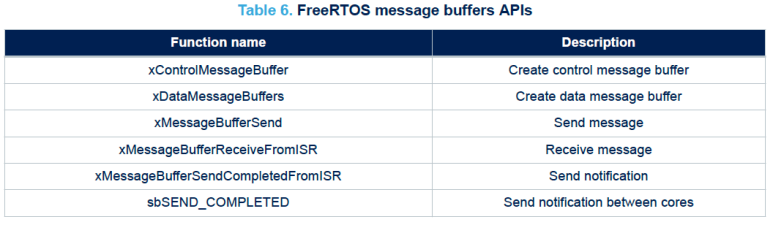 4. 메시지 버퍼를 통한 코어 투 코어 통신은 메시지 버퍼가 공유 메모리 내에서 두 코어 모두에 알려진 주소에 있어야 합니다. 다음 표에서는 FreeRTOS 메시지 버퍼 API에 대해 설명합니다.