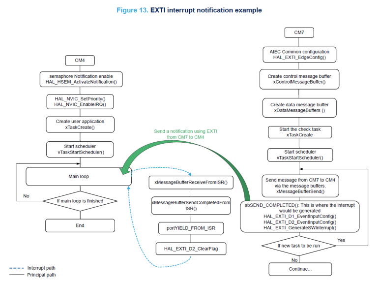 첫 번째 그림은 EXTI를 사용한 동기화 메커니즘을 보여주고 두 번째 그림은 EXTI 인터럽트 알림을 위한 스니펫 코드가 있는 순서도를 보여줍니다.