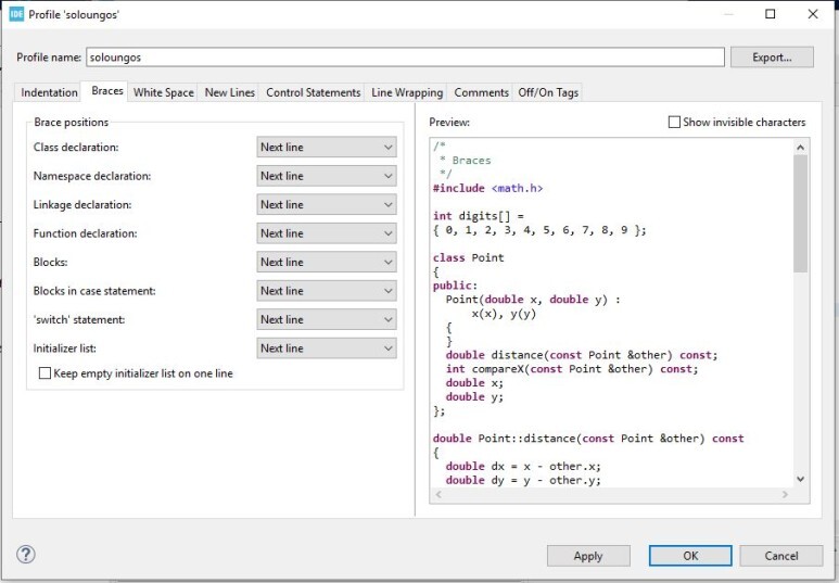 모든 Braces를 Next line으로 변경하였으며 Preview에서 확인 할 수 있습니다.