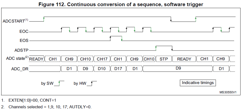 위의 예시는 여러가지 ADC 타이밍 중에서 가장 이해하기 쉬운 타이밍도인 것 같아 첨부했습니다. 총 4개의 Channel을 아래의 순서대로 Sequence로 Scan하여 변환하고 있습니다.