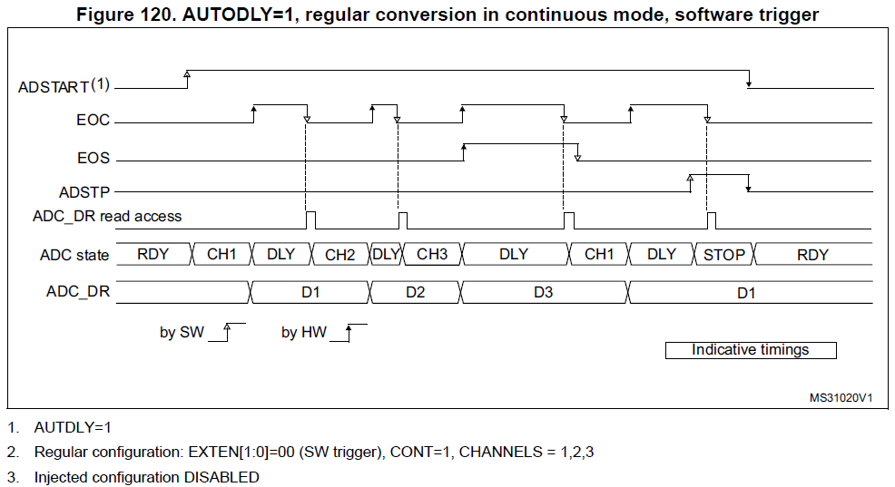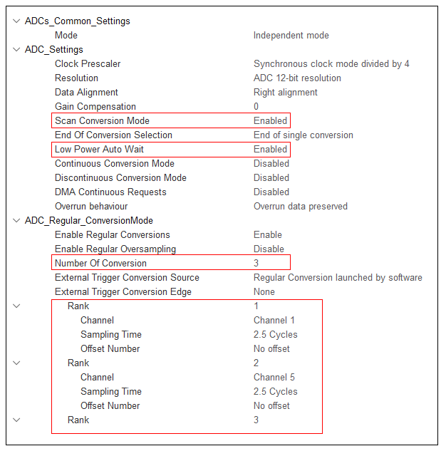 중요한 것은 우리는 여러채널을 한번에 Conversion 하기 위해서 Scan Conversion Mode을 Enable 합니다. 그리고 Overrun을 발생하지 않도록 Low Power Auto Wait (AUTDLY)를 Enable합니다.
