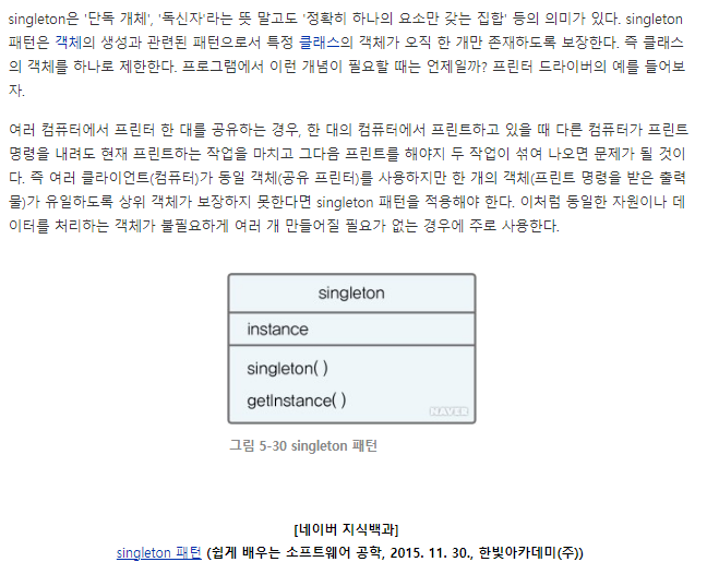 이번장에서는 프로그램 전체적으로 한개의 자원을 사용하는 경우 적용할 수 있는 디자인 패턴 Singleton 패턴에 대해 알아보겠습니다.