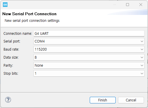 3. New Serial Port Connection 창이 뜨면 각종 정보를 알맞게 넣습니다. 연결하려는 Port 번호와 Baud rate는 정확히 입력하셔야 합니다.