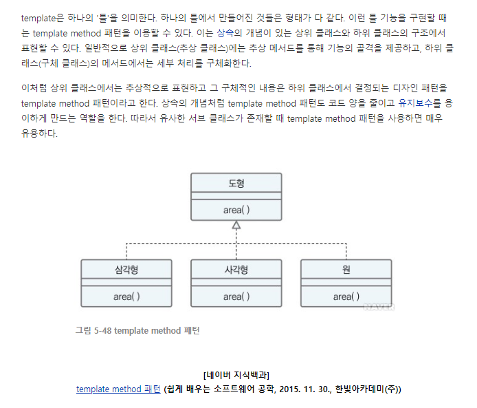 Template method(템플릿 메소드) 디자인 패턴도 매우 유용한 패턴입니다. 기능은 같으나 구현방법이 다른 메소드들의 구조를 제시하고 기능과 구현방법이 같은 메소드는 대표로 하나만 제시되는 방법입니다.
