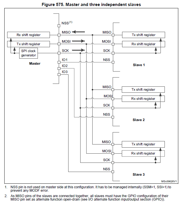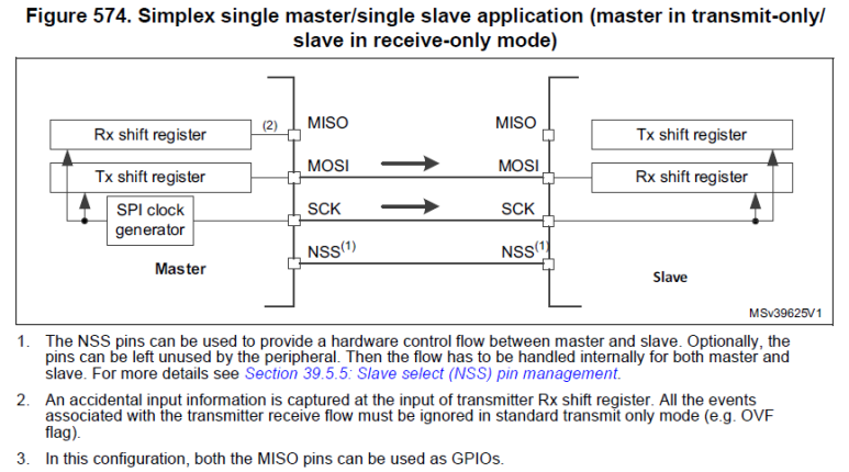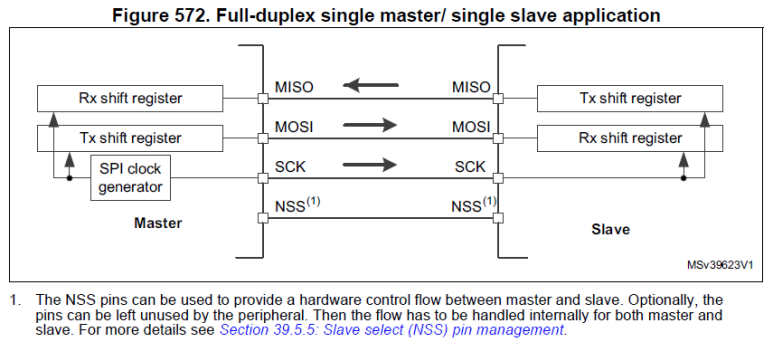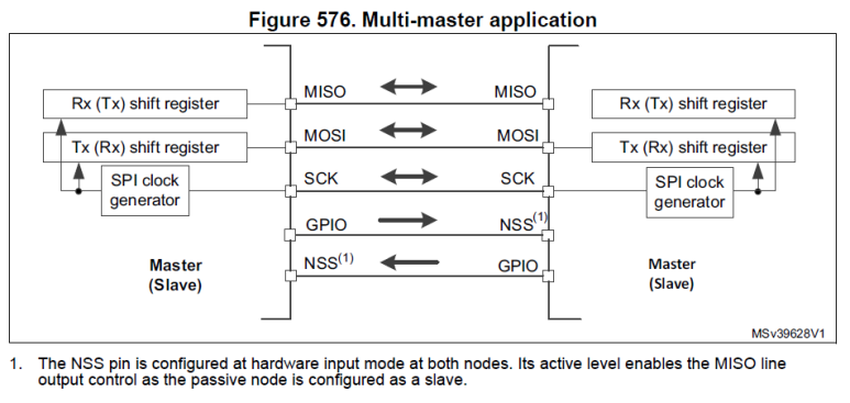 아주 드물게 Multi master로 어플리케이션을 구현하는 경우에는 GPIO - NSS를 각각 연결해 두어야 합니다. 평소에는 양쪽이 모두 Slave였다가 송신을 시도하는 쪽에서 Master의 역할을 가져가는 방법으로 통신하게 됩니다. 소프트웨어의 결함으로 양쪽에서 모두 송신을 시도하는 경우 쇼트가 발생할 수 있으니 시리얼 저항이나 Open-drain으로 회로를 꾸미는 것이 안전합니다.