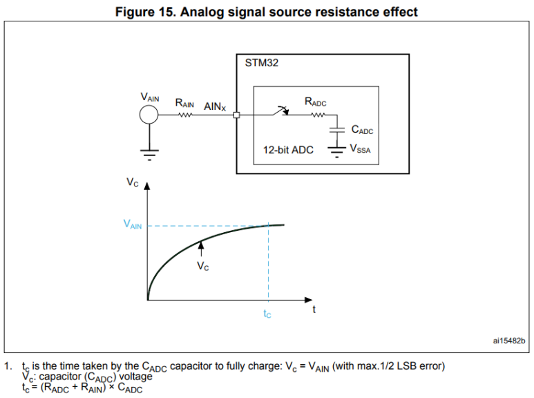 흔히 ADC는 그림2처럼 구성되는데 아날로그 신호의 임피던스 혹은 VAIN과 AINx 사이의 RAIN은 전압 강하(Drop)를 일으킵니다. 이후 RADC 앞의 Switch 가 닫히면 CADC가 충전되기 시작하며 그림2의 계산식으로 CADC의 충전 시간을 유추해 볼 수 있습니다.