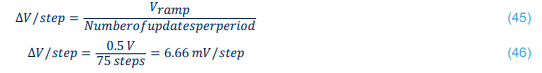 HRTIM 비교(Capture Compare) 장치 3은 이 애플리케이션 노트의 다음 섹션에서 톱니파형 발생기 업데이트를 위한 트리거 소스로 구성됩니다. 따라서 (44)에서 계산된 66ns는 이 업데이트 속도를 달성하기 위해 HRIM 타이머 틱 수로 변환됩니다. 그런 다음 각 하위 간격에서 DAC에서 빼는 값은 (46)에서 계산됩니다.