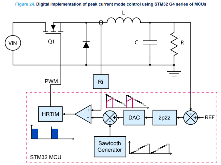 이전에 설명한 아날로그 피크 전류 모드 구현은 피크 전류 감지 비교기(Comparator)를 사용하여 수요 피크 전류와 실제 측정된 전류의 교차를 감지합니다.