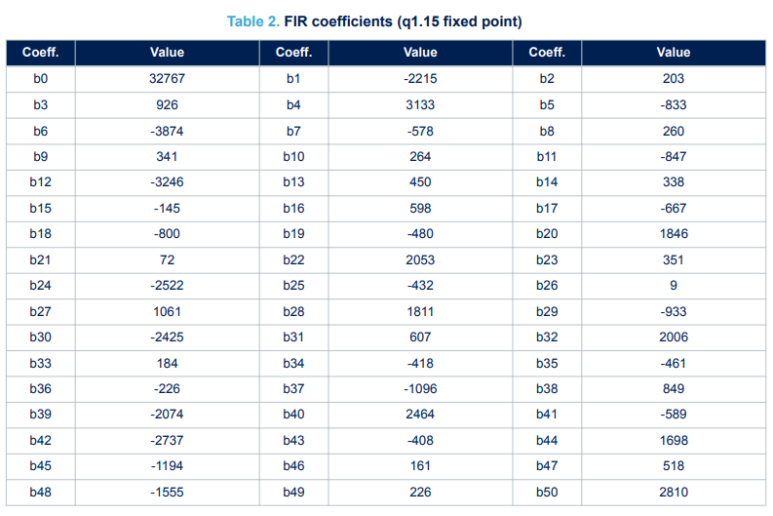 cortex-M4에서 위의 작업은 프로세서 부동 소수점 장치(FPU)를 사용하고 8클럭 사이클이 걸립니다. 따라서 51개의 계수를 변환하려면 ~408 클럭 사이클이 필요합니다.