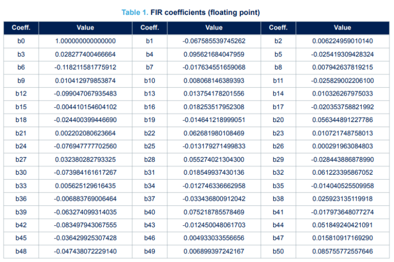 이 예에서 생성된 부동 소수점 및 고정 소수점 필터 계수는 각각 표 1과 표 2에 나열되어 있습니다(프레임 1의 경우).