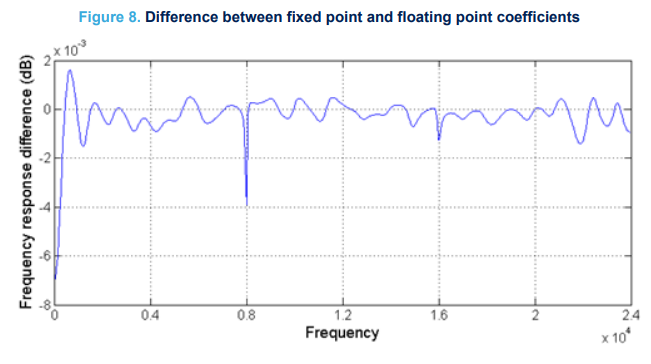 이 예에서 고정 소수점 필터 스펙트럼은 0.007dB 이내로 부동 소수점과 동일합니다(그림 8).