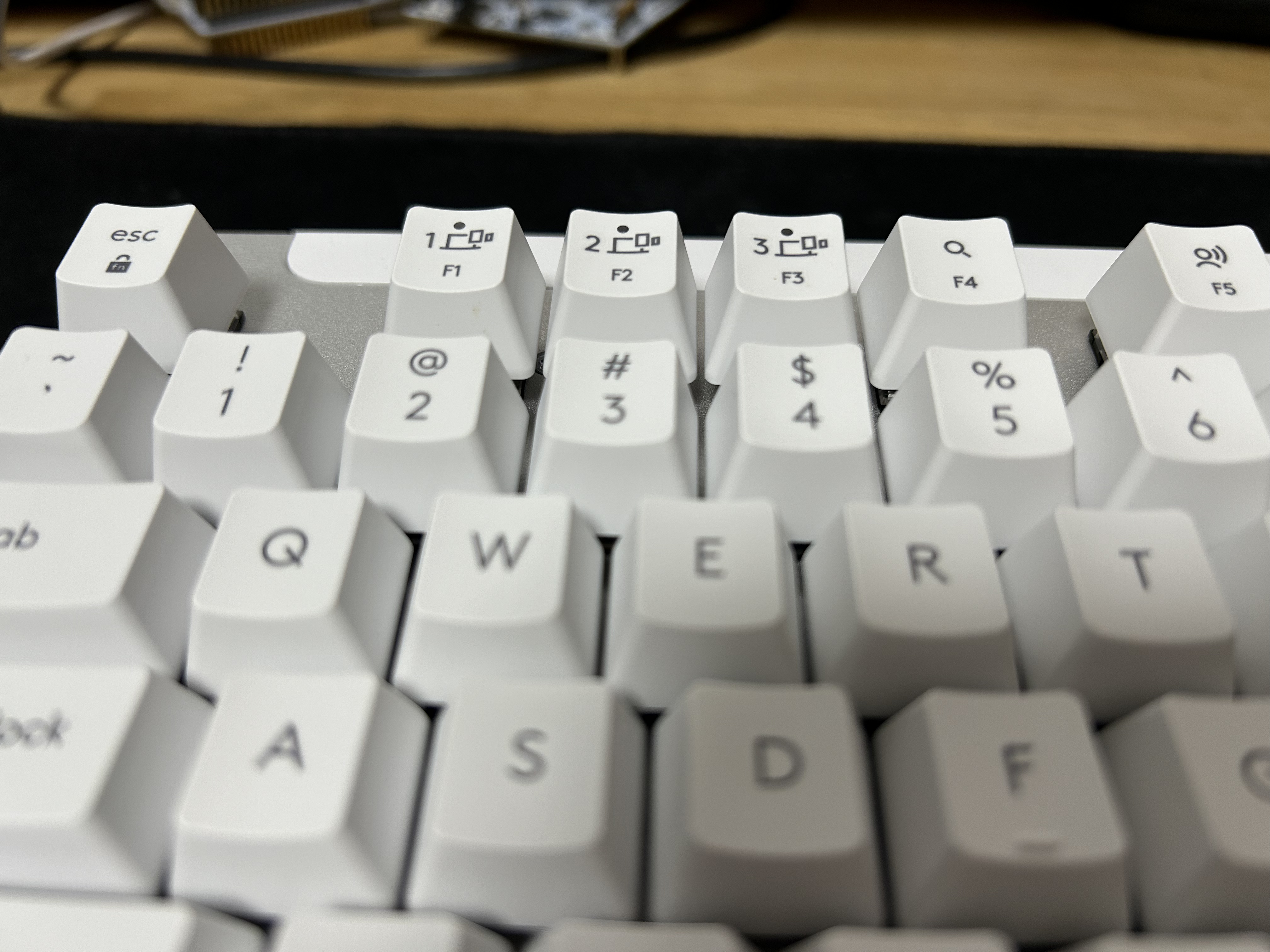 해외 직구라서 한글자판이 인쇄되어 있지 않습니다. 상판이 알루미늄이어서 고급스럽게 보입니다. 3개까지 블루투스로 붙일 수 있고 로지텍 볼트 USB 동글도 지원하고 있었습니다.