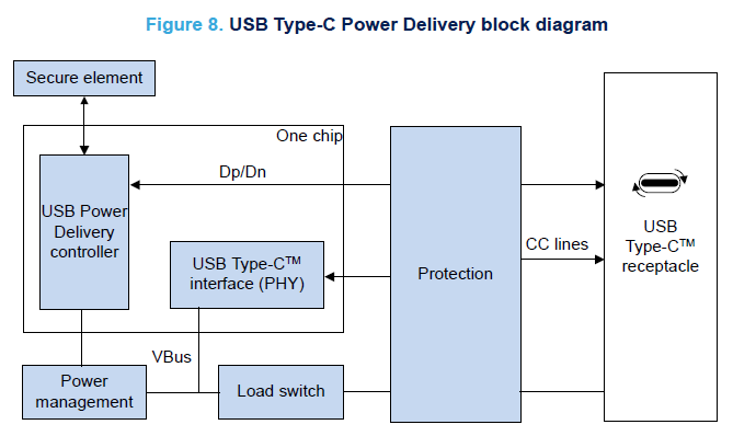 STM32 MCU 및 STM32 MPU는 STM32 통합 UCPD(USB Type-C Power Delivery) 주변 장치 또는 범용(GP) 주변 장치 세트를 사용하여 USB Type-C/USB Power Delivery 인터페이스를 처리합니다. USB Type-C 및 Power Delivery 애플리케이션 페이지를 참조하십시오.