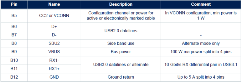 • Sink: 포트 전원 역할. CC 핀에서 Rd(Pull-down 저항. 그림 3. Pull up/down CC detection 참조)를 노출하고 VBUS(5V ~ 20V, 최대 5A)에서 전력을 소비하는 포트, 가장 일반적으로 장치(예: 레거시 유형) -B 포트)