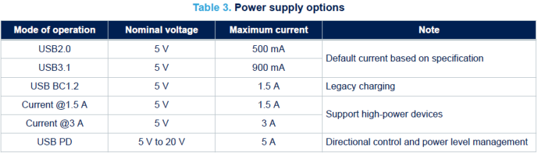 USB Type-C® 커넥터가 있는 장치의 관점에서 사용할 수 있는 전원 옵션은 아래와 같이 나열되어 있습니다.