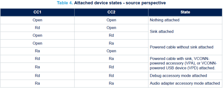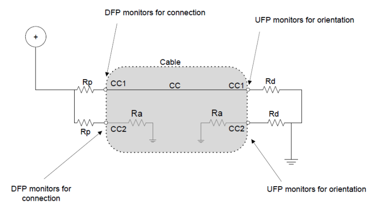 처음에 DFP는 CC 핀에 Rp 종단을 제공하고 UFP는 CC 핀에 Rd 종단을 제공합니다. 연결을 감지하기 위해 DFP는 두 CC 핀을 모두 모니터링합니다([17]의 그림 4-30 참조).