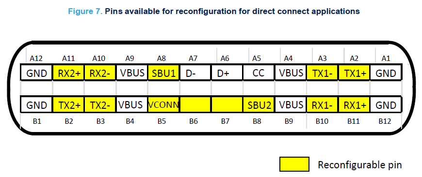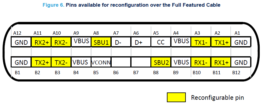 그림 6에서 노란색으로 강조 표시된 핀은 완전한 기능을 갖춘 케이블에서 재구성할 수 있는 유일한 핀입니다.