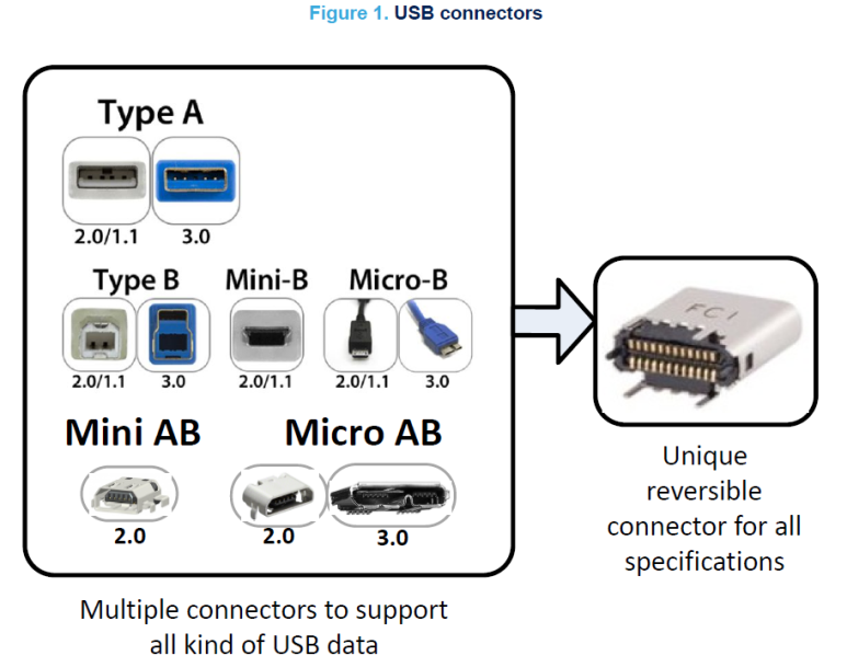 그림 1. USB 커넥터에서 볼 수 있듯이 새로운 USB Type-C® 플러그는 이전 플러그가 제공하는 모든 기능을 포함하여 유연성을 보장하고 애플리케이션을 단순화합니다.