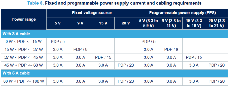 고전류(5A) 성능은 USB Power Delivery 프로토콜을 사용하여 협상됩니다. 표 5는 [17]에 따라 가능한 값을 보여줍니다.