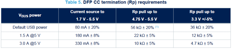 Type-C는 기본 USB 표준 외에 1.5A 및 3A의 향상된 전류 용량을 제공합니다. 장치에 대한 포트의 전류 공급 기능은 DFP의 Rp Pull-up 저항 값에 따라 다릅니다.