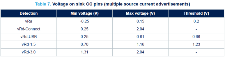 표 7. Voltage on sink CC pins (multiple source current advertisements)